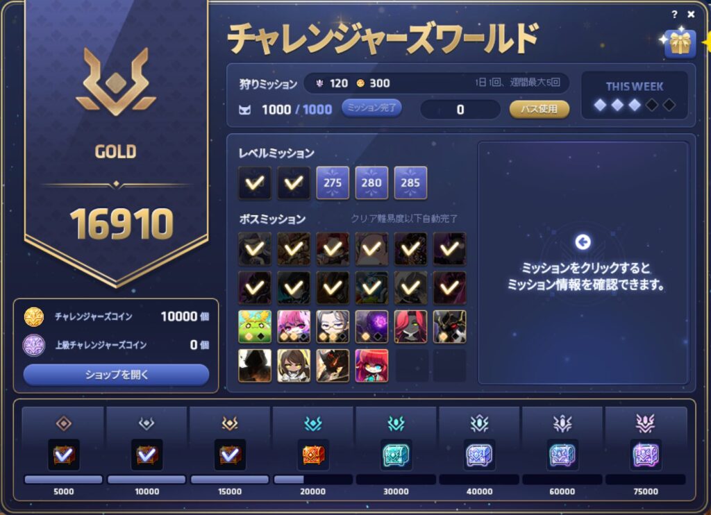 | レベルアップミッション | Lv.275到達 | 5000 |